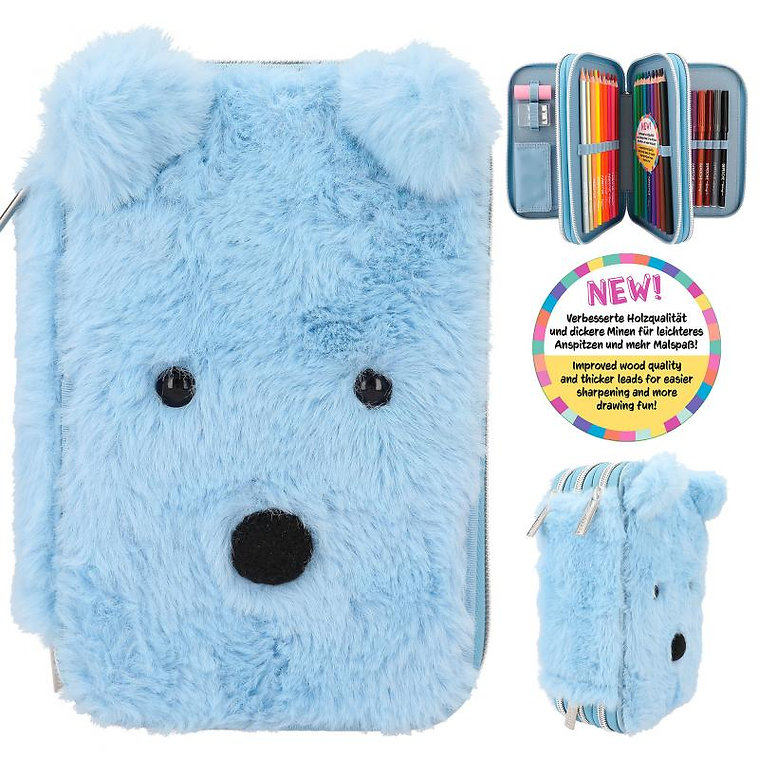 Penarul polar din seria TOPModel ICEWORLD este atat de pufos! Realizat din plus dragalas. Cele trei compartimente sunt complet echipate cu 18 carioci, 18 creioane colorate (Nou: cu o calitate Imbunatatita a lemnului), 2 creioane, ascutitoare, radiere,foarfece si rigla. Material: 100% poliester.