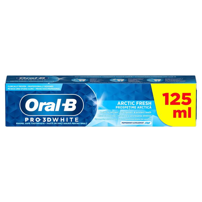 Pasta de dinti Oral-B Pro 3D White Vitalizing Fresh este dovedita clinic, indeparteaza pana la 87% din petele de suprafata si incepe albirea dupa primul periaj.ATENTIONARE:Copiii de 6 ani si mai mici: folositi o cantitate de pasta de dinti de marimea unui bob de mazare pentru a reduce cantitatea inghitita. Daca se administreaza fluor din alte surse consultati medicul dentist. Contine fluorura de sodiu (1450 ppm fluorura).