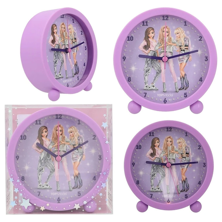 E timpul pentru glamour TOP MODEL! Acest ceas cu alarma rotund violet are trei TOP MODEL elegante si pietre mici stralucitoare pe cadran. Cu efect luminos si maini linistite. Baterie (1x AA 1,5V) inclusa si inlocuibila.